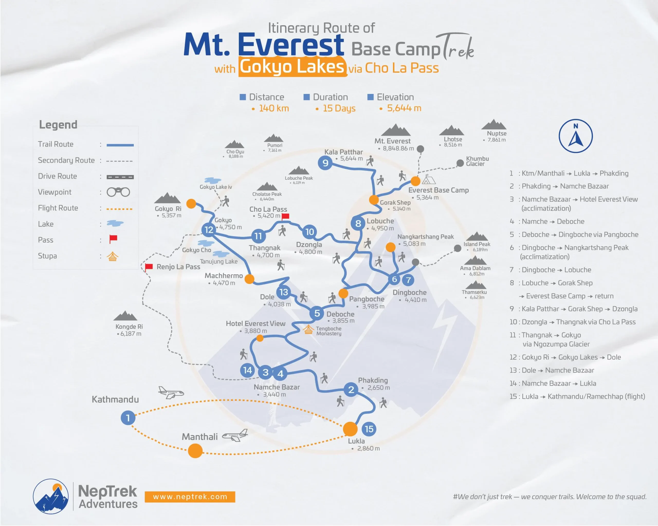 Every traveller’s needs are different. For many, 15 days might be an ideal duration to complete this trek. However, for some, this trek might not be doable in 15 days. Or, some prefer to fly out from Gokyo or Namche instead of walking back to Lukla and taking a flight to Manthali.